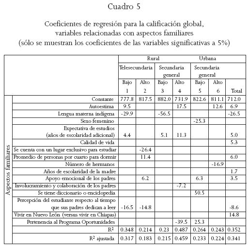 De acuerdo a la primera etapa del análisis, donde sólo se analizan las variables relacionadas con aspectos familiares, la pertenencia al Programa Oportunidades tiene un efecto significativo en los estratos 4 y 5 (véase cuadro 5). Llama la atención que en el alto, de secundaria general rural (4), tener la beca Oportunidades repercute en forma negativa en la calificación global; mientras que en el bajo, de secundaria general urbana, ocurre lo contrario.