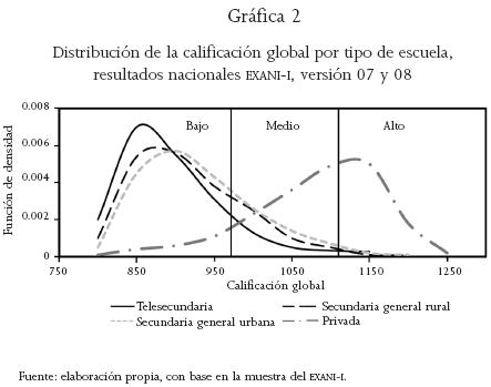 La gráfica 1 indica la función de densidad estimada para cada tipo de escuela, con base en los resultados de la muestra. Se aprecia que la mayoría de los alumnos, 77.6 por ciento, indistintamente del tipo de plantel, obtuvo calificación en el rango bajo. Sólo cerca de 3 por ciento puede clasificarse como desempeño alto y el resto dentro del medio.