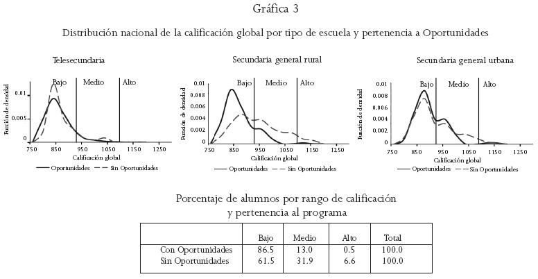 Es notable que en las telesecundarias las distribuciones de ambas calificaciones casi se superponen, esto podría indicar que son pocas las diferencias entre la distribución de las calificaciones globales de los alumnos con y sin el Programa Oportunidades. También son muy parecidas entre los estudiantes de la secundaria general urbana, salvo en los rangos medio y alto (son más los de calificaciones bajas con la beca). Esto pudiera indicar que los chicos inician con desventajas que el programa es incapaz de eliminar.