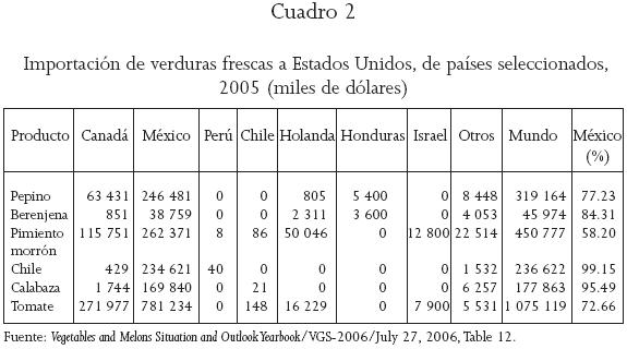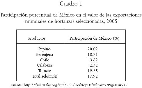 En términos más precisos, en 2004 el valor mundial de las exportaciones agrícolas fue de 604 mil millones de dólares americanos, de acuerdo con datos delAnuario estadístico de la Organización de las Naciones Unidas para la Agricultura y Alimentación, FAO, por sus siglas en inglés (20052006). Los productos más exportados fueron los cereales, que en 2004 representaron en valor alrededor de 8 por ciento y de 17 las frutas y vegetales. Las cinco hortalizas objeto del presente estudio, las más importantes de Sinaloa, son el tomate, pepino, calabaza, chile y berenjena, que participaron con cerca de 1.5 por ciento en las exportaciones agrícolas mundiales, según datos de la FAO. Por su parte, el importe de las ventas de EE UU al extranjero en 2005 fue de 65 mil millones de dólares americanos, destacaron las de California, que en 2004 sumaron 9 mil millones de dólares, según datos del Departamento de Agricultura de Estados Unidos (USDA 2006). La presencia de México en este rubro en 2005 es notoria, como se aprecia en el cuadro siguiente.