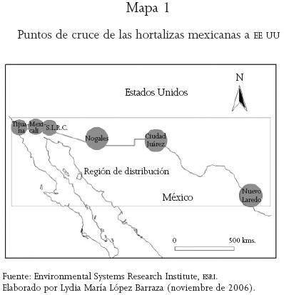 Cuando comenzó la horticultura de exportación de Sinaloa, las distribuidoras en frontera actuaban como promotoras, comercializadoras y facilitadoras. Los horticultores dependían de ellas, puesto que las hortalizas debían cortarse en un tiempo preciso y comercializarse de inmediato en un mercado de precios fluctuantes. Este nodo de distribución se localiza en la zona fronteriza de México con EE UU, y los puntos de cruce principales, además de Nogales, son Tijuana, Mexicali, San Luis Río Colorado, Ciudad Juárez y Nuevo Laredo (véase mapa 1). Estas ciudades colindan, respectivamente, con sus pares estadounidenses de Nogales (Arizona), San Diego y Caléxico (California), San Luis (Arizona), El Paso y Laredo (Texas).
