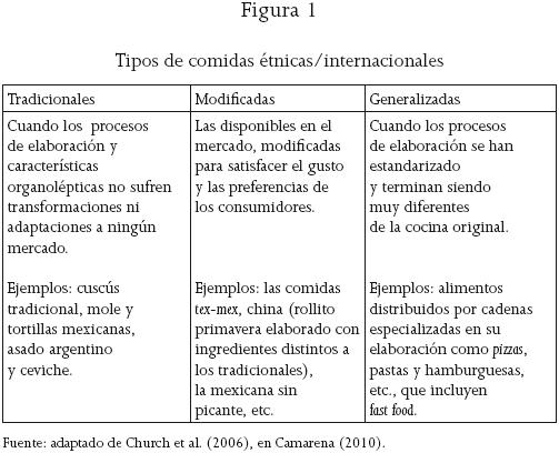 Las comidas étnicas o internacionales se pueden clasificar en tres tipos: tradicionales, modificadas y generalizadas (véase figura 1), en función de sus procesos de elaboración y las características organolépticas del alimento final. Asimismo, pueden prepararse con ingredientes locales, del país de origen o con una combinación de ambos (Camarena 2010). En esta investigación se consideran las internacionales modificadas y las generalizadas, porque son las más ampliamente difundidas en el mercado regional y conocidas por más consumidores.