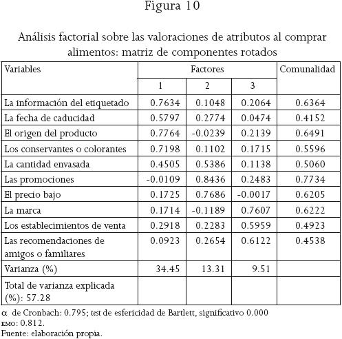 Las valoraciones hacia los atributos se agruparon en tres factores, que en conjunto explican 57.28 por ciento de la variabilidad de los datos, valor que en las ciencias sociales se considera admisible (Ibid., 93). El primer factor, denominado información, recoge 34.45 por ciento de la varianza total y se integra por las variables información de etiquetado, fecha de caducidad, origen del producto y conservantes o colorantes. El segundo aglutina 13.31 por ciento de la variabilidad de los datos y se compone de las variables cantidad envasada, promociones y precio bajo, por tanto se llama económico. Por último, el tercero explica 9.51 por ciento de la varianza, y está constituido por variables como la marca, establecimiento de venta y recomendaciones de amigos o familiares, por tanto, se le ha designado confianza.
