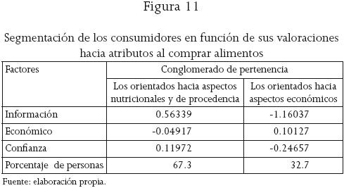 Las puntuaciones factoriales individuales se utilizaron como base de segmentación en un análisis cluster. Entre las técnicas disponibles se ha usado la kmeans, en la cual se decide a priori el número de segmentos, y según su tamaño se seleccionaron dos grupos (véase figura 11). Así, en el primero están las personas que toman más en cuenta las propiedades intrínsecas de los productos, el origen, la caducidad y cuestiones informativas, es decir, todas las características que pueden brindarle una mayor confianza. En el segundo se agrupan quienes se preocupan por la economía al momento de realizar sus compras; buscan promociones, precios bajos, pero sin dejar de lado la buena calidad, ya que se fijan en la marca y toman en cuenta las recomendaciones de familiares o amigos, es decir, son consumidores orientados hacia la búsqueda de productos con una buena relación calidadprecio. El primer segmento, denominado consumidores orientados hacia lo nutricional y de procedencia es mucho más grande, y representa 67.3 por ciento de la muestra, en tanto que el segundo, llamado consumidores orientados hacia aspectos económicos, constituye 32.7.