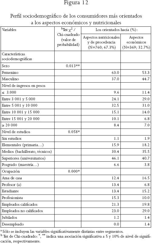 El perfil sociodemográfico se expone en la figura 12. En general, los consumidores más orientados a cuestiones económicas son en gran proporción empleados (calificados y no), amas de casas, desempleados y jubilados; un mayor porcentaje cuenta con estudios medios o inferiores, y una cantidad superior percibe ingresos en el rango inferior a los 10 mil pesos mensuales. En contraparte, los orientados a aspectos nutricionales y de procedencia tienden en mayor medida a concentrar más personas con ingresos superiores y son más las mujeres. Asimismo, desempeñan ocupaciones como profesores, profesionistas y empleados calificados, y un porcentaje mucho más alto de ellos tiene estudios superiores y de posgrado.