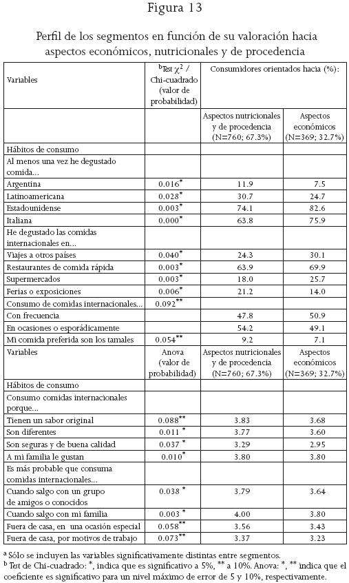 Con el fin de ahondar más en las características de los consumidores, el estudio se completó con un perfil basado en hábitos de ingesta alimentaria y, en concreto, de comidas internacionales. Con ello se pretendía indagar sobre factores explicativos de actitudes, conocimiento y preferencias que influyen en el comportamiento. Así, al considerar a los dos grupos, se observan diferencias significativas en cuanto a los hábitos de consumo entre ambos (véase figura 13). Los resultados muestran que existe una relación entre las comidas internacionales que se han degustado y las valoraciones de las personas sobre los atributos de los productos. Así, por ejemplo, la argentina u otras latinoamericanas han sido probadas por ambos segmentos de consumidores, con una supremacía ligera en los más orientados a lo nutricional y de procedencia. Mientras que la degustación de la estadounidense (82.6 por ciento) e italiana (75.9) se acentúa en el segmento más orientado a lo económico (74.1 y 63.8 por ciento a la nutrición y procedencia). Es posible que estas preferencias se relacionen con la mayor disponibilidad de restaurantes de comidas étnicas generalizadas o fast food, los cuales suelen ofrecer costos relativamente bajos.