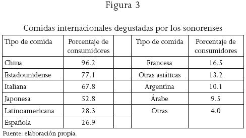 Los resultados permiten visualizar que prácticamente todos los sonorenses las han degustado en al menos una ocasión. Las más demandadas son la china, estadounidense, italiana y japonesa con una amplia presencia de restaurantes especializados y de comida rápida, que a su vez se posicionan como las principales fuentes de conocimiento entre la gente. Si se considera lo anterior, es de suponer que una proporción amplia ha probado comidas internacionales modificadas y generalizadas.