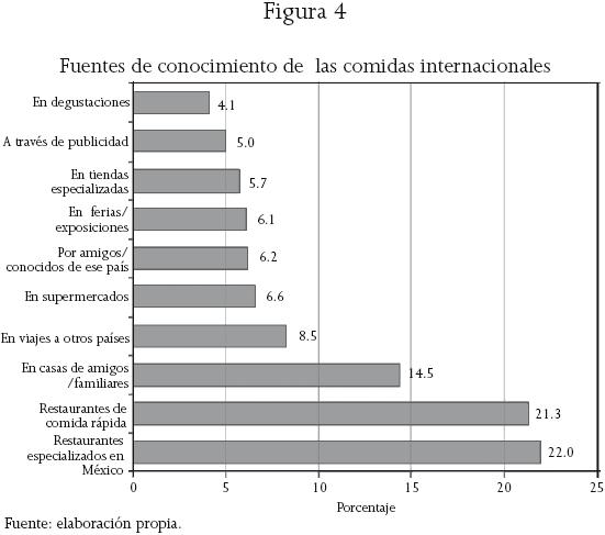 Entre las formas de conocimiento de los platillos internacionales, los restaurantes de comida rápida se destacan como la fuente principal, en especial en la gente más orientada hacia los aspectos económicos (69.4 y 60.9 por ciento, respectivamente). Los viajes realizados a otros países y la degustación en restaurantes, así como en supermercados, ferias o exposiciones son también otras fuentes de conocimiento para tener en cuenta, pero con una importancia inferior.