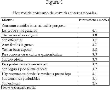 El conocimiento sobre las comidas internacionales puede ocurrir a través de canales distintos, como se expone en la figura 4. Las motivaciones para consumirlas suelen diferir entre segmentos de personas (Camarena y Sanjuán 2008); véase la figura 5 para el caso de Sonora.
