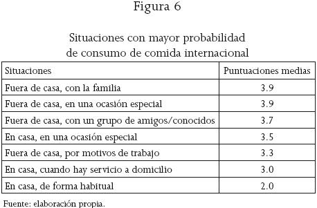 Las situaciones de consumo más probables se muestran en la figura 6, y los resultados dejan entrever que se relacionan en mayor medida con actividades de ocio o esparcimiento, mientras que las ligadas con el trabajo o con un consumo rutinario todavía son incipientes y poco probables. Estas tendencias coinciden con las obtenidas en otros estudios en los que la población nacional tiende en mayor medida a optar por este tipo de alimentos fuera del hogar, mientras que otros grupos de población, como los inmigrantes prefieren ingerirlos en casa (Camarena y Sanjuán 2010; Datamonitor 2005; Verbeke y Poquiviqui 2005; Batres et al. 2003).
