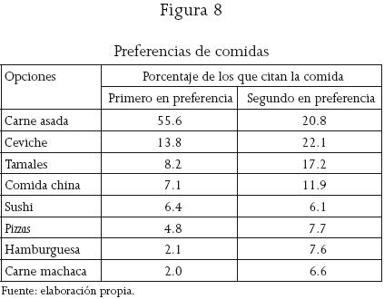 De las opciones mostradas, se pedía a los participantes que evaluasen por orden de importancia sus preferencias. Los resultados aparecen en la figura 8. Se puede afirmar, por tanto, la predilección por los platillos tradicionales, sonorenses y mexicanos en general que siguen siendo parte importante de la dieta de la gente, en especial la carne asada, el ceviche y los tamales. También se advierte que aun cuando la preferencia favorece a las comidas autóctonas, las internacionales se han ido posicionado en el gusto y elección de una parte de los sonorenses.