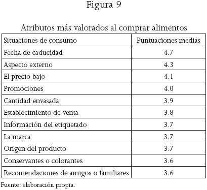 La lista de los atributos más valorados, cuando se compran los alimentos en general, aparece en la figura 9. La tendencia observada es conceder mayor importancia a los atributos externos y al aspecto económico de los productos, que a los relacionados con la procedencia y el contenido, entre otros.
