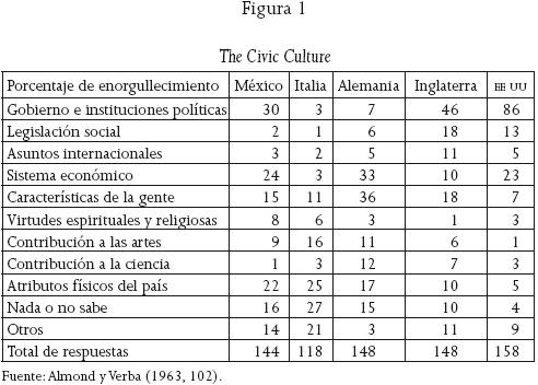 Almond y Verba (1963) acuñaron la noción de cultura política, y la entienden como cúmulo de conocimientos, sentimientos y evaluaciones en relación con el sistema político. Esto es, un conjunto de atributos y productos de las sociedades humanas, que son extrasomáticos y trasmisibles por mecanismos distintos de la herencia biológica (Kroeber y Kluckhohn 1952). En su modelo, Almond y Verba (1963) podían presentarla idealmente de tres formas: localista, subordinada y participante. En la primera, los individuos no participan ni esperan nada del sistema, saben muy poco del papel del gobierno y de sus funcionarios, y expresan una fuerte suspicacia y ausencia de confianza con respecto a sus autoridades. En la segunda, los sujetos se relacionan directamente con el sistema, le exigen una donación o beneficio a cambio de aceptar las dinámicas del poder. En este tipo de relación social, las personas aceptan de manera pasiva su inserción, sin poner en tela de juicio la legitimidad de la autoridad, incluso los subordinados apoyan con afecto al gobierno y se sienten orgullosos de él. En la tercera, los individuos están insertos en el sistema, y participan con tal de influir en la formulación de la política. Quienes se identifican con este tipo de relación social apoyan o rechazan al gobierno, con base en la legitimidad. Con este modelo, Almond y Verba realizaron una comparación entre México, Italia, Alemania, Inglaterra y Estados Unidos, mediante una encuesta.