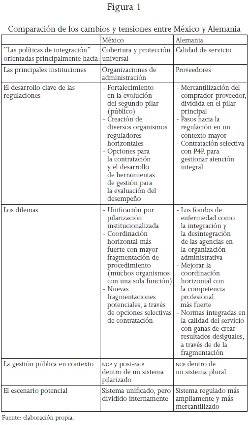 Sin embargo, el cambio institucional lleva una tendencia similar en las dos naciones. Si bien las reformas son sobre países concretos en términos técnicos (en México, el fortalecimiento del segundo pilar público y la creación de organismos reguladores horizontales; y, en Alemania, pasos hacia la regulación en un contexto en el área de aseguramiento de calidad); para ambos, los fondos de herramientas de la NGP son de gran importancia. Se espera que las principales unidades de la administración de salud mexicana puedan embarcarse en la contratación profesional libre y en la evaluación del desempeño sistemático, y su homólogo alemán se ha puesto en el camino de la mercantilización de la división comprador-proveedor (en el pilar de la seguridad social). No obstante, Alemania ha ido mucho más lejos en cuanto a la prestación de servicios basados en contratos, ya que tanto los instrumentos como los contratos selectivos (algunos con P4P) y la atención integrada han conseguido añadir los acuerdos corporativos de muchos años. Ambos países han visto intentos de ampliar el espacio para la regulación horizontal mejorada. En México se han creado una serie de comisiones para este fin, mientras que los cuerpos corporativos en Alemania se han involucrado de manera más amplia en las políticas de control de calidad.