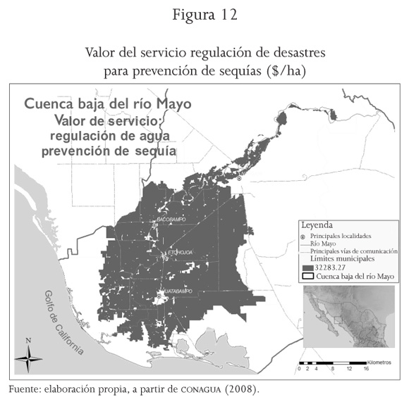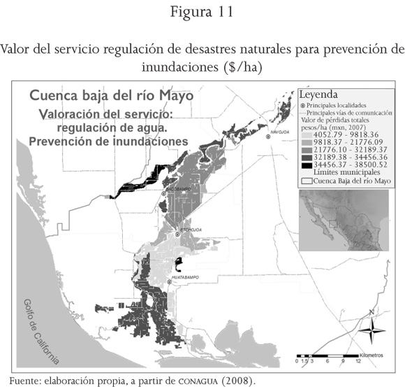 Las inundaciones son fenómenos frecuentes en el mundo, sus causas, por lo general están relacionadas con alteraciones de la naturaleza, como la deforestación. Al respecto, existen muchos casos documentados en los últimos años, como los de Niger, en 2010 (Descroix et al. 2012); Australia, en 2011 (Okada et al. 2014); Minot, Dakota del Norte, Estados Unidos, en 2011 (Atkinson 2014), y múltiples eventos en Europa y Japón (Deasy et al. 2014; Tezuka et al. 2014). En México pueden referirse el caso de Tabasco, en 2007, donde 80 por ciento del territorio de la entidad quedó bajo el agua (SEMARNAT 2008); el de Guaymas y Empalme, en 2009; el de Veracruz, en 2010 y, por supuesto, el de la cuenca baja del río Mayo, en 2008, que ocasionó inundaciones y otros daños (CONAGUA 2013), cuya cuantificación es una forma de establecer el valor que tendría que la naturaleza proporcionara el servicio de regulación de desastres naturales, que en este caso se traduce en prevención de inundaciones. Tal cuantificación comprende las pérdidas en 9 074 hogares y en 29 263 hectáreas agrícolas principalmente, aunque se incluyen algunos otros aspectos como los vinculados con infraestructura y salud. La figura 11 muestra las zonas de inundación y su valor por superficie, según las pérdidas económicas asociadas.