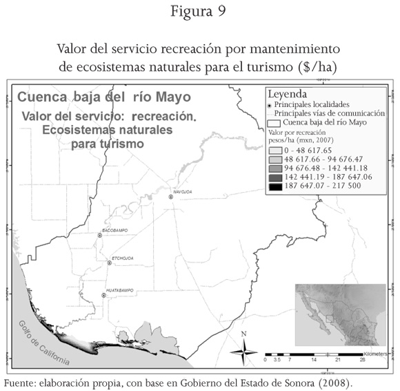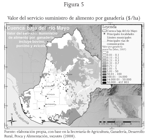 Los modelos de representación espacial de los servicios que involucran las actividades productivas se construyeron con la información biofísica espacial de cada una. El valor se asignó a partir de sus valores de producción, utilidad promedio aproximada y extensión superficial, y se distribuyó de acuerdo con la resolución o el detalle de la información. Por ejemplo, para la agricultura los datos fueron generados por los 16 módulos del distrito de riego 038 Río Mayo, Sonora; en la ganadería extensiva, los valores se asignaron en función de la capacidad de la vegetación para soportar la carga animal.