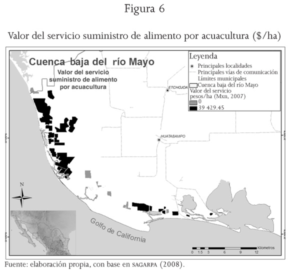 La acuacultura en Sonora es una fuente importante de divisas, que en 2011 superaron los 540 millones de dólares (SAGARPA 2012). Sin embargo, para establecer una granja acuícola se requiere del desmonte del lugar donde se ubicará, por lo que éste ya no se valora en función de su biodiversidad y los servicios de regulación que prestaba, sino de la provisión de alimento, por lo que adquiere el valor de la producción ahí generada o el de su utilidad, de acuerdo con el método de valoración empleado. En este caso, la utilidad total obtenida por la acuacultura se dividió entre la superficie de granjas en funcionamiento (véase figura 6).