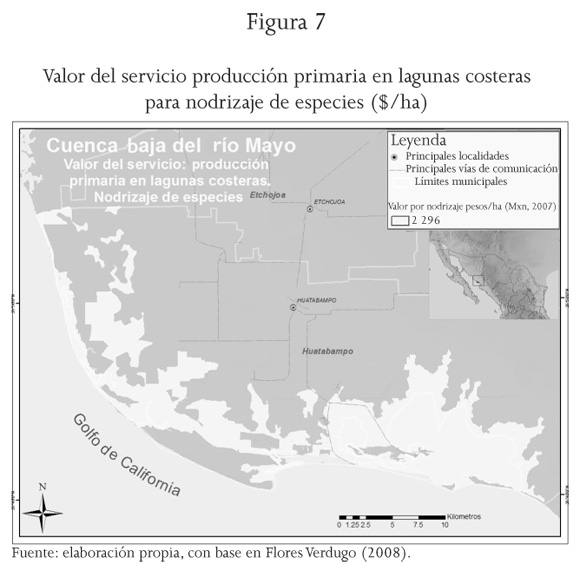 La naturaleza proporciona el nodrizaje de especies a través de las lagunas costeras. Estos humedales se asocian con cierto tipo de vegetación, que cuenta con las estructuras físicas apropiadas y los nutrientes necesarios para la reproducción de especies. El mangle y la vegetación halófila son los más comunes, de ahí que a ambos se les asignara el valor por nodrizaje, que fue homogéneo debido a que, como lo sugiere Flores Verdugo (2008), la producción de especies pesqueras por superficie de mangle y vegetación asociada es, en promedio, de 800kg/ha al año (véase figura 7).