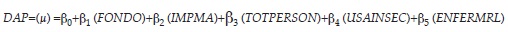 En esta ecuación, el parámetro de la variable FONDO se refleja como β, estimada en α. La disposición a pagar promedio anual por persona resulta de la multiplicación DAPPmi por 12. La disposición a pagar total mensual (DAPTm) se encuentra multiplicando la DAPPmi por el total poblacional del área de estudio. La disposición a pagar total anual (DAPTa) se obtiene de la multiplicación entre la DAPTm por 12 (los meses del año).