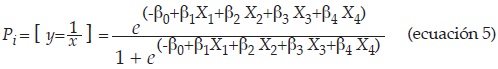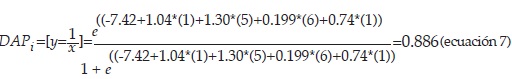 Así, ante cualquier modificación en los valores de las variables, la probabilidad de la DAP cambiará. Lo anterior puede demostrarse sustituyendo los valores reales otorgados por el individuo al modelo estimado en la ecuación 6. Si se sustituyen los valores para xi11 se obtiene la ecuación 7.