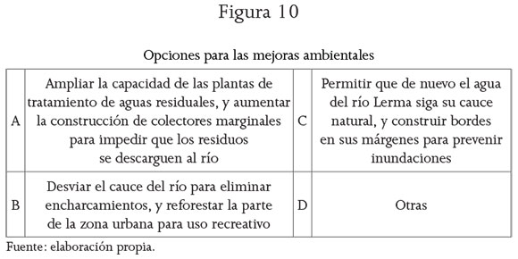 En relación con la aplicación del método de valoración contingente, se aprecia la dificultad para elaborar el instrumento de recolección de información (la encuesta), como consecuencia del sesgo y desviaciones que se deben evitar en las respuestas. Por otra parte, el esfuerzo preliminar en el diseño de la encuesta y en la información del material que la conforma fue esencial para el éxito de la experiencia. En este caso, las ayudas visuales expuestas (fotografías y mapas) facilitaron la comprensión del mercado hipotético planteado, que consistió en tres propuestas del proyecto general, que se expusieron ante representantes de los tres órganos de gobierno en 2010. La primera, aislar al meandro de la dinámica fluvial del río, para lo que se obtendría agua de las plantas de tratamiento y se usaría la pluvial en presas reguladoras. La segunda, incorporar al meandro a la dinámica del río, y obtener el agua sólo de él. Y, la tercera, modificar el meandro, para crear un paseo ecológico fluvial, el agua provendría del propio río, fluvial y de las plantas de tratamiento, con lo que se lograría un mayor control en la cantidad y calidad del agua, un saneamiento permanente y la incorporación de 150 mil m2 como corredor turístico, de esparcimiento deportivo. La exposición parece haber minimizado el posible sesgo de desinformación, sin embargo, lo anterior no impidió que las tasas de no respuesta sobre la disposición a pagar fueran altas.
