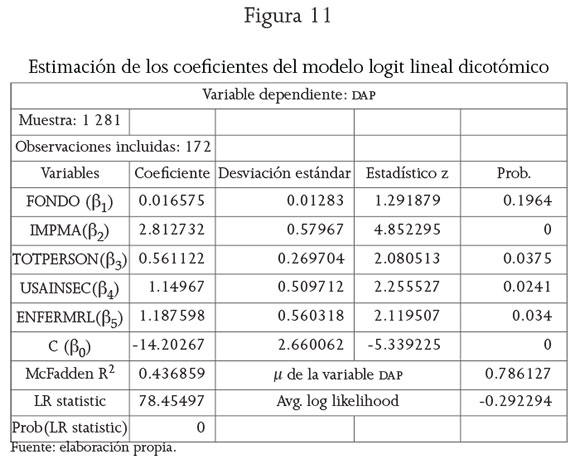 10 Aquí se usa el presente modelo para medir los cambios en la probabilidad de la DAP por cambios en las variables independientes. No se usará para el cálculo de media de la DAP, porque en la regresión de la figura 9 no se incluyó la variable FONDO.