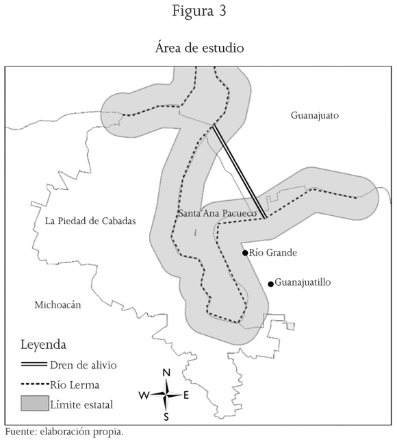 4 Para conveniencia de los investigadores, se determinó un área de estudio que va de los márgenes del río a 600 metros dentro de La Piedad y de Santa Ana Pacueco, tal y como se muestra en el área sombreada en gris de la figura 3.