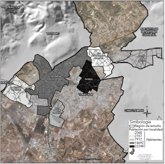 Para mayor precisión, la región de estudio se localiza en el centro de la ciudad capital en el municipio de Tlaxcala, lugar donde está situado el PCU1. La CONAVI definió los PCU1 como espacios donde puede haber una o más localidades urbanas. Sus principales características son la alta concentración poblacional y las fuentes de empleo dentro del perímetro. Para efectos de este trabajo, la región de estudio está compuesta por seis localidades, pertenecientes al municipio de Tlaxcala, que están consideradas dentro del primer perímetro de contención urbana (PCU1). Las localidades que integran la región de estudio son: La Trinidad Tepehitec, Ocotlán, San Buenaventura Atempan, San Gabriel Cuauhtla, Santa María Ixtulco y Tlaxcala de Xicohténcatl. En la Figura 2 se muestran la región y los rangos de población de las localidades que la componen.