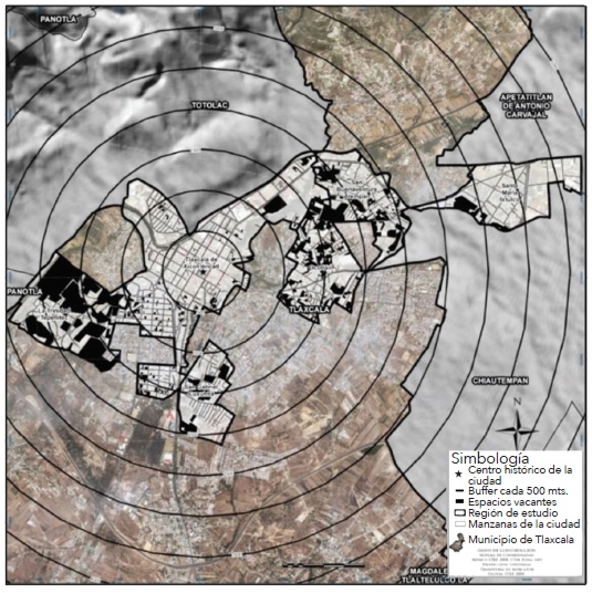 También se hizo un análisis espacial de distribución radial por colonias, y se concluyó que la colonia con mayor número de espacios vacantes no necesariamente es la que tiene mayor potencial para ser densificada. Ejemplo de lo anterior es que en la colonia Centro se localizan 97 espacios vacantes del total en la región de estudio, que fueron 213, lo que representa 54.54%; sin embargo, sólo cubre 10% de la superficie total que ocupan los espacios identificados en las seis localidades de la región estudiada (La Trinidad Tepehitec, Ocotlán, San Buenaventura Atempan, San Gabriel Cuauhtla, Santa María Ixtulco y Tlaxcala de Xicohténcatl). Lo anterior significa que los vacíos urbanos del centro de la ciudad son de menor tamaño en comparación con los que se localizan de manera progresiva y radiocéntrica hacia la periferia; es decir, a medida que nos alejamos del centro, mayor es el tamaño del suelo intraurbano vacante.
