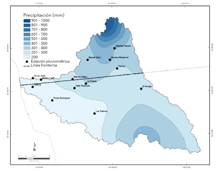 El régimen de precipitaciones es invernal; es decir, más de 75% de la lluvia se presenta entre diciembre y marzo. En la estación meteorológica (pluviométrica) Presa Rodríguez, en Tijuana, la precipitación promedio anual es de 232 mm para el periodo 1948-2016 (CONAGUA, 2017). En la parte estadounidense, en la estación meteorológica Campo, la precipitación anual promedio es de 372 mm, y de 227 mm en la estación meteorológica Chula Vista, lo que indica la variabilidad de lluvia según la altitud (véase Figura 2).