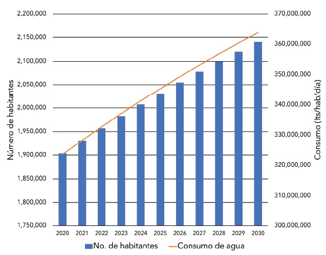 Las proyecciones demográficas de la población mexicana indican que se conservarán las tasas de crecimiento entre 2020 y 2030 (véase Figura 5). De cumplirse estas proyecciones, en 2030 la población de la cuenca alcanzará 2 140 363 habitantes, los cuales requerirán mayores volúmenes de agua, que equivaldrán a 363 861 710 litros al día (0.37 hm3 al día o 135.1 hm3 al año), los cuales se tendrán que cubrir con aguas subterráneas y superficiales.4