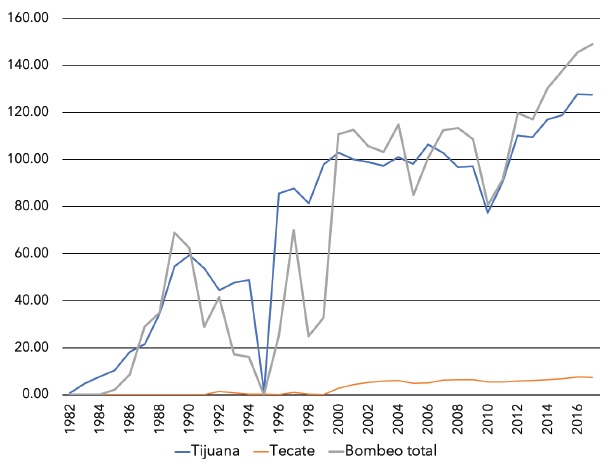 La construcción del ARCT favoreció el crecimiento urbano y poblacional de Tijuana y Tecate al aumentar la superficie urbana en 49.4 km2 durante la década de 1990. El aumento en la disponibilidad de agua cubrió las necesidades de la población y también evitó la dependencia de los volúmenes irregulares en la presa Rodríguez, que sólo se ha llenado en años de máximas lluvias: 1978, 1983, 1993 y 1998 (véase Figura 3). La Figura 7 presenta la evolución de los volúmenes bombeados y entregados a través del ARCT.