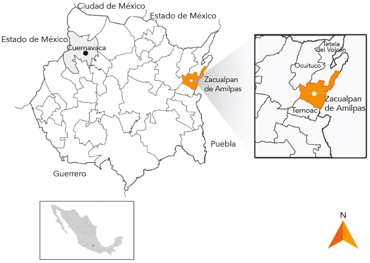 Zacualpan de Amilpas se ubica al nororiente del estado de Morelos. Colinda con Tetela del Volcán, que se localiza en las faldas del Popocatépetl, elevación muy importante que comparte con el Estado de México y con Puebla (véase Figura 1). El municipio se compone de dos localidades: la cabecera del mismo nombre y Tlacotepec. Se encuentra más o menos a cien kilómetros (km) de Cuernavaca, la capital del estado. Su clima es semicálido subhúmedo y templado subhúmedo. Su temperatura promedio es de veinte grados centígrados. En 2020 tenía una población de 9 965 habitantes (Instituto Nacional de Geografía y Estadística [INEGI, 2020]). Ésta es mestiza y la mayoría de las personas profesa la religión católica, por lo que las principales festividades aluden a esas creencias. Cuenta con servicios e infraestructura básica y vías de acceso favorables para el transporte privado y público (H. Ayuntamiento Constitucional Zacualpan de Amilpas 2016-2018, 2016; trabajo de campo 2019 y 2020).