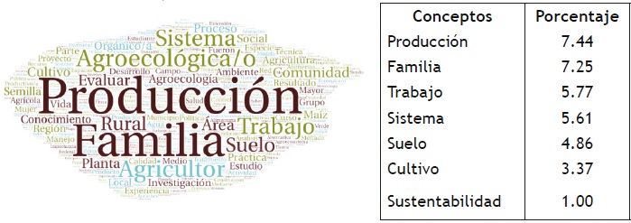3. Suponer la existencia de un bagaje contextual en cada concepto contenido en los resúmenes, ⸻por lo tanto, también cualidades como maleabilidad, apertura y capacidad para expresar iconográficamente contextos y significados derivados de su entorno conceptual⸻, posibilitando su exposición como mapas semánticos subyacentes (Freire, 1973, p. 17; Leydesdorff y Welbers, 2011). Considerando dicha capacidad de significación y tomando en cuenta la propiedad contextual y reticular del discurso agroecológico, así como la posibilidad de expresar una determinada explicación de su posible significado a través de medios iconográficos (Brandes, Raab y Kenis, 2005; Tufte, 1997, p. 9), se decidió por una aproximación lexicométrica para exponer tendencias y voces conceptuales emergentes en los constructos semánticos. Con esta aproximación se visualizaron jerárquicamente, como nube de palabras (word clouds), los conceptos mejor valorados o frecuentados por los autores de los textos revisados y su representación sintética, lo que significó tener una aproximación general a las prominencias ideológicas contenidas en el propio lenguaje agroecológico.