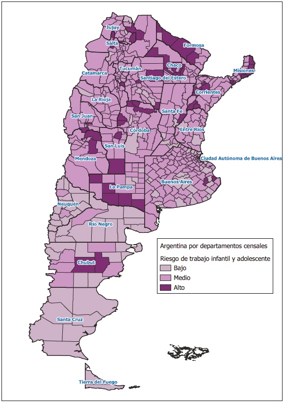 Atendiendo entonces a una perspectiva cuantitativa del estudio del trabajo infantil y con un enfoque de equidad y derechos, en este documento se presenta una propuesta metodológica innovadora que combina diferentes fuentes de datos actualizados para trascender los alcances de las estadísticas disponibles a escala nacional de manera agregada, integrando las particularidades de la dimensión territorial de los departamentos censales de Argentina.2 Así mismo, teniendo en cuenta que el país presenta una matriz de desigualdad social con importante heterogeneidad entre las jurisdicciones subnacionales (Piovani y Salvia, 2018), las herramientas de geoprocesamiento que se implementan representan un aporte significativo y de gran utilidad para el diseño y el monitoreo de estrategias multisectoriales de intervención local.