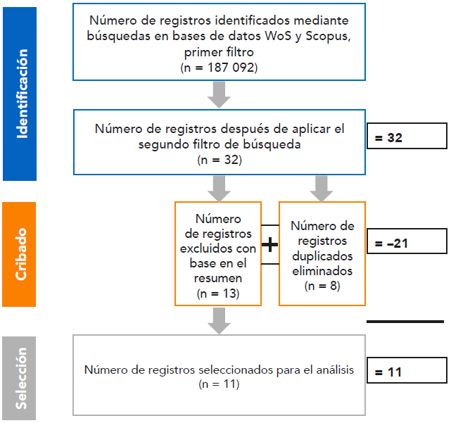 Se llevó a cabo una revisión metódica de las bases de datos incluidas en las plataformas Web of Science (WoS) y Scopus, sistemas que recopilan de forma multidisciplinaria índices regionales, de especialidad, de datos y de patentes, y que al mismo tiempo indizan cada uno de los artículos, con lo cual se obtienen redes de citas completas y complejas que impulsan el descubrimiento de conocimiento y el análisis confiable de este (Clarivate, 2021). En palabras de Higgins y Green (2011), una revisión sistemática comienza con una pregunta, utiliza métodos explícitos para identificar, seleccionar y evaluar de manera crítica la información relevante; también para recopilar y analizar datos de los estudios incluidos en la revisión, lo que la hace reproducible y fiable.