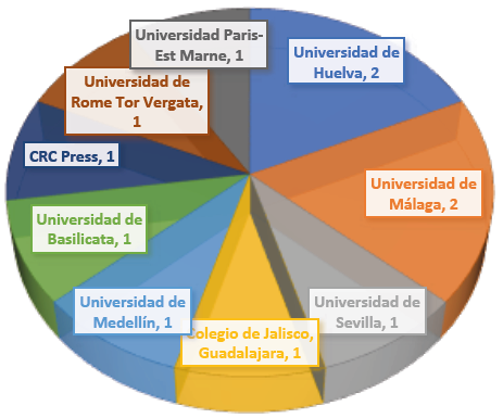 En relación con el país de origen del autor principal de cada artículo, se supo que cinco de ellos son de España, dos de Francia, dos de Italia, uno de México y uno de Colombia. También se detectó que, de los once documentos seleccionados, cuatro están escritos en inglés y los otros siete en español. Además, las once investigaciones recibieron apoyo institucional, ya fuera de la editorial CRC Press o de las universidades de Málaga, Sevilla, Huelva, El Colegio de Jalisco, Medellín, Rome Tor Vergata, Paris-Est Marne y Basilicata (véase Figura 2).