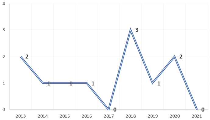 | Núm. | Texto | 2014 | 2015 | 2016 | 2017 | 2018 | 2019 | 2020 | 2021 | Total |