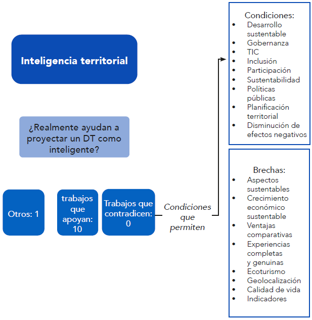 En la Figura 6 se muestra un esquema en el cual se recopilan las condiciones necesarias para que un destino turístico se proyecte como inteligente y, las oportunidades de investigación detectadas a lo largo del análisis bibliográfico. Se observan también las condiciones que permiten proyectar un DT como inteligente mediante la aplicación de la IT. Estas fueron identificadas con base en lo que plantean los autores citados: el desarrollo sustentable, la gobernanza, el uso de las tecnologías de la información y comunicación, la inclusión y participación de todos los actores involucrados, la sustentabilidad que se persigue y desea, las políticas públicas diseñadas y establecidas, la planificación territorial y la búsqueda activa de la disminución de los efectos sociales y medioambientales negativos que causa el turismo.