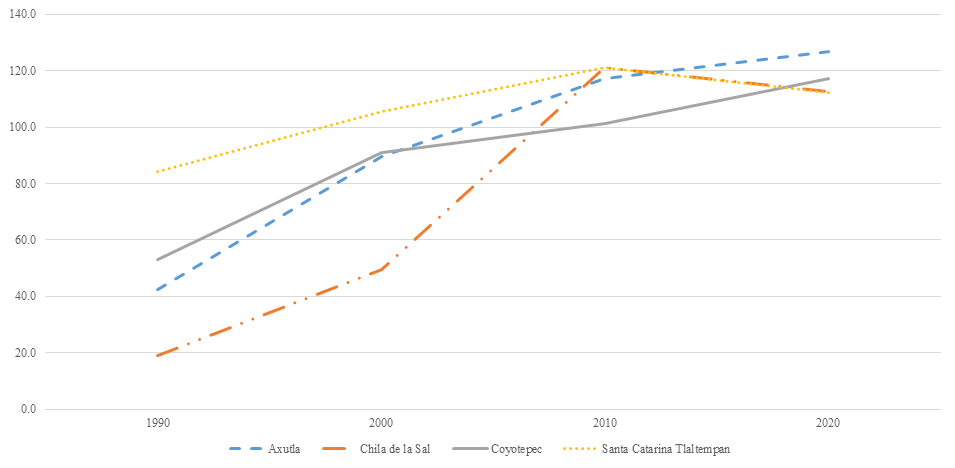 Otro aspecto que se percibe en la población mayor es la presencia de hogares unipersonales y de parejas solas, situación que se presenta en todos los municipios que se estudiaron, aunque cada uno tiene sus particularidades. En Santa Catarina Tlaltempan y en Coyotepec, la falta de oportunidades laborales en la comunidad ha obligado a los más jóvenes a emigrar a las ciudades y a visitar de vez en cuando a sus familiares adultos mayores. En Axutla y en Chila de la Sal, también hay mucha migración, pero a Estados Unidos, lo cual dificulta el regreso a las comunidades, de modo que ha ido aumentando el hecho de que las personas mayores vivan solas sin hijos y sin ninguna red de apoyo familiar cerca.