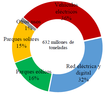 Como se aprecia en la Figura 11, 36% de este volumen tan solo lo demandará la fabricación de vehículos eléctricos. Y no es para menos. En 2020 las ventas de automóviles livianos de cuatro ruedas fueron de alrededor de 75.7 millones de unidades, de las cuales cerca de 3 millones fueron de carros eléctricos, esto es, que funcionan exclusivamente con baterías recargables. Las estimaciones indican que las ventas de estos últimos vehículos se van a multiplicar 9 y 16 veces entre 2030 y 2040, al sumar ventas por 28 millones y 50 millones de unidades, respectivamente (González y Cantallopts, 2022).