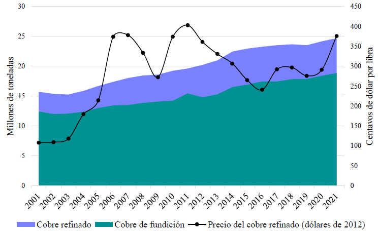 La producción cuprífera mundial registró un aumento sustancial durante las primeras décadas del siglo XXI. En 2001 el volumen de cobre de mina (que no incluye el cobre reciclado) fue de 13 millones 757 mil toneladas. Veinte años después, esta producción se incrementó 55.2%, al registrar un total de 21 millones 353 mil toneladas (Reichl y Schatz, 2023). Como se observa en la Figura 1, esta elevación se produjo en gran medida durante la década de 2010, impulsada por la multiplicación por cuatro del precio real del cobre refinado que, en 2011, registró un valor histórico de 403 centavos de dólar por libra (a dólares de 2012), mientras que en 2001 la libra de cobre alcanzó una cotización de 108 centavos de dólar.