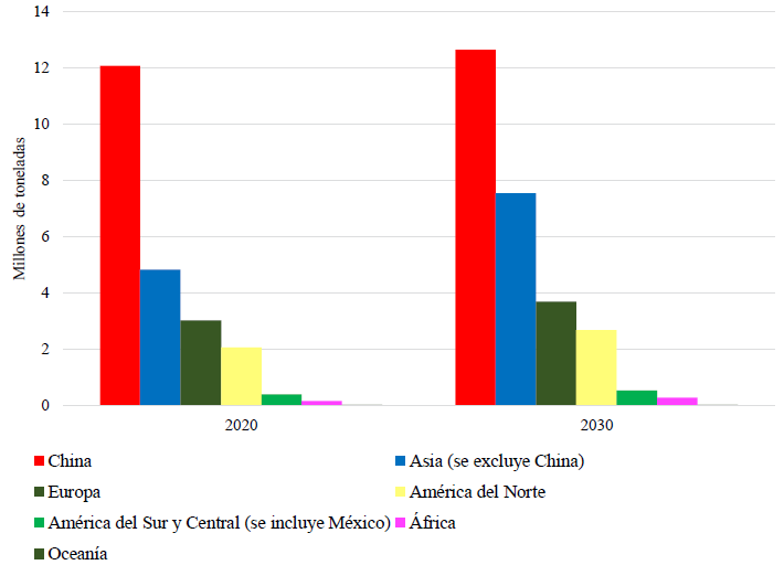 Las perspectivas para 2030 señalan que China continuará siendo el principal consumidor de cobre del mundo, aunque con un dinamismo menor que el que presentó en la última década. En Asia (China excluida), la demanda aumentará 56.3% al requerir 7.5 millones de toneladas en 2030. Este incremento será superado solo por África, ya que se espera que, en los próximos diez años, este continente requiera un volumen de 81.7% mayor que el que se registró en 2020 (véase Figura 7).