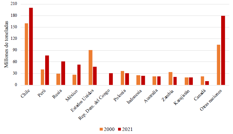 Figura 2 Cambios en la producción mundial de cobre de mina, 2001 y 2021