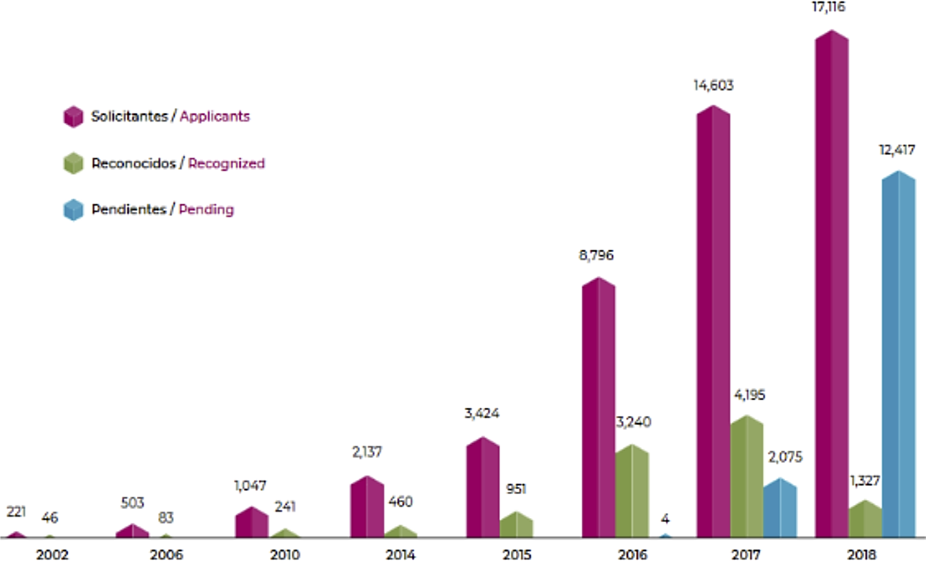 Gráfica 1 Total de personas solicitantes, reconocidas y con estatus pendiente en México 2002-2018