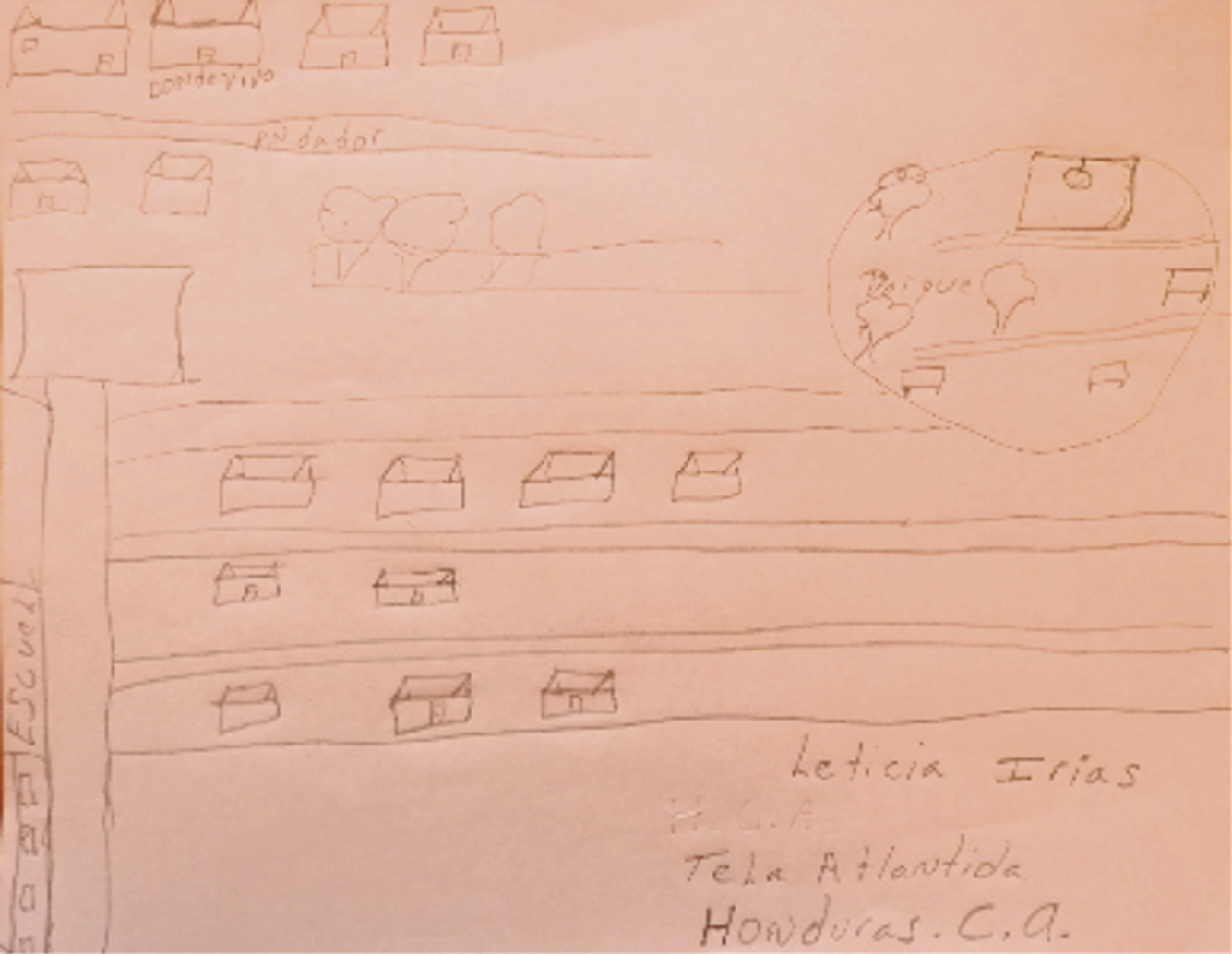 En el momento de las entrevistas Leticia estaba dentro del PESYN, pero actualmente ya no. Debido a la pandemia por COVID-19 no tuvo trabajo por un tiempo. Actualmente labora en un restaurante. Sus hijos ya no viven con ella. Uno regresó a Honduras y el mayor trabaja en un estado del norte de México. En cuanto a la ciudad, expresa que su día a día está centrado en su trabajo. Por ello, en su dibujo indica el lugar donde vive, por donde camina y el parque donde se encuentra el ayuntamiento. Ha hecho amistades con personas de su país y con ellas comparte costumbres tales como la elaboración de los platos típicos de allá. Frecuenta la iglesia católica y la playa el Gancho que le recuerda las de Honduras (véase Foto 4).