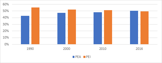 El envejecimiento poblacional se puede observar en los datos que se presentan en la Gráfica 1, en la que se observa cómo disminuye la población económicamente inactiva (PEI) constantemente durante el periodo, y cómo aumenta la población económicamente activa (PEA), tomando en cuenta que esta última se encuentra por encima del rango de edad de los 12 años, lo que puede ser un indicativo del envejecimiento poblacional del estado (INEGI, 2016).