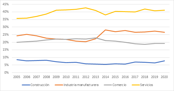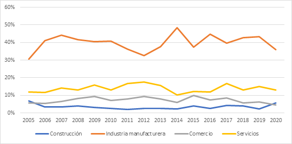 Para corroborar la hipótesis anterior se recurrió a los datos de la ENOE, los cuales arrojaron que, efectivamente, el principal subsector de la actividad económica en el que se insertan los chiapanecos en Tijuana es la industria maquiladora, que pasó de albergar a 31% de los trabajadores del estado del sur durante el año 2005, a 36% en 2020, pero llegó a albergar a 48% en 2014. Los subsectores que le siguen son los de servicios, comercio y construcción, aunque para 2020 había más chiapanecos trabajando en la industria de la construcción que en actividades relacionadas con el comercio (véase Gráfica 11).