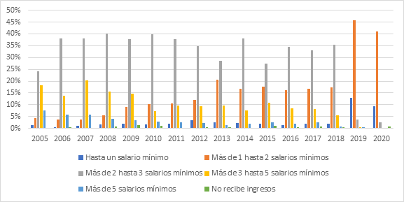 Gráfica 12 Nivel de ingreso de los trabajadores chiapanecos en Tijuana, 2005-2020