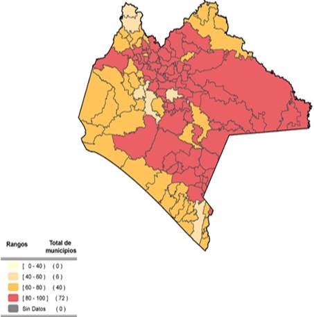 Chiapas es catalogado como el estado con menor diversificación productiva, como sostienen Israel y Pintor (2018), y sus municipios ostentan el mayor índice de marginalidad y pobreza social del país, según el CONEVAL (2015). Entre sus indicadores destacan los siguientes: 78.4% de la población se encuentra en condiciones de pobreza y 32.8% en pobreza extrema; 82.4% carece de seguridad social, 43.2% no tiene acceso a los servicios de salud y 30.3% padece hambre (CONEVAL, 2015); existen además municipios con niveles muy elevados de pobreza, como Chanal (99.6%), San Juan Cancúc (99.65%), Aldama (99.6%), San José Duraznal (99.5%), Nicolás Ruiz (99.4%) y Chalchihuitán (79.8%), entre otros. En pocas palabras, la entidad cuenta con 100 de los municipios más pobres y marginados del país (Villafuerte y García, 2014; CONEVAL, 2015) (véase Mapa 1).